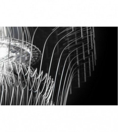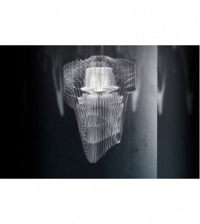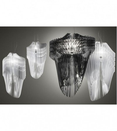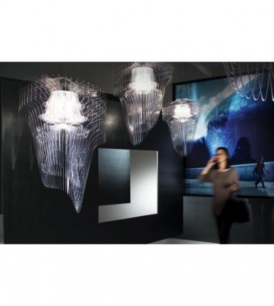 Zaha Hadids dynamic and visionary architecture results in a volume that is apparently dematerialised, where illumination and lightness blend, defining natural design, becoming almost aquatic. 50 transparent surfaces, encountering LED lights positioned on their axis, take on a texture and enlighten the space with a vibrant atmosphere.